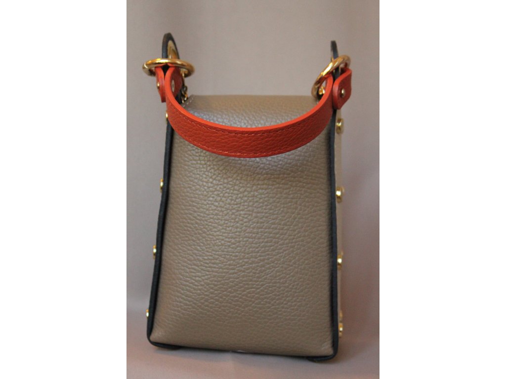 Tento model je ručně zpracovaný italskými řemeslníky a díky kvalitní kůži nabízí dlouhou životnost i luxusní vzhled. Po stranách je zdoben kovovými nýty, které dodávají kabelce moderní charakter. Díky menším rozměrům je ideální jako večerní kabelka nebo módní doplněk pro elegantní městský styl.