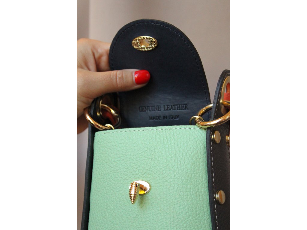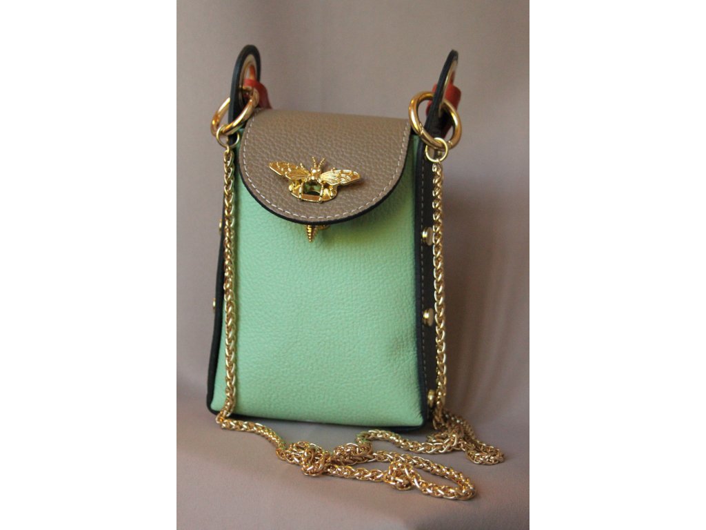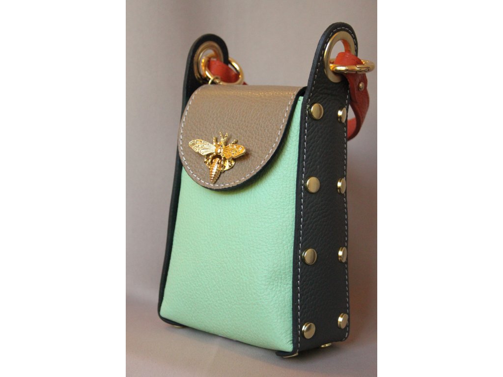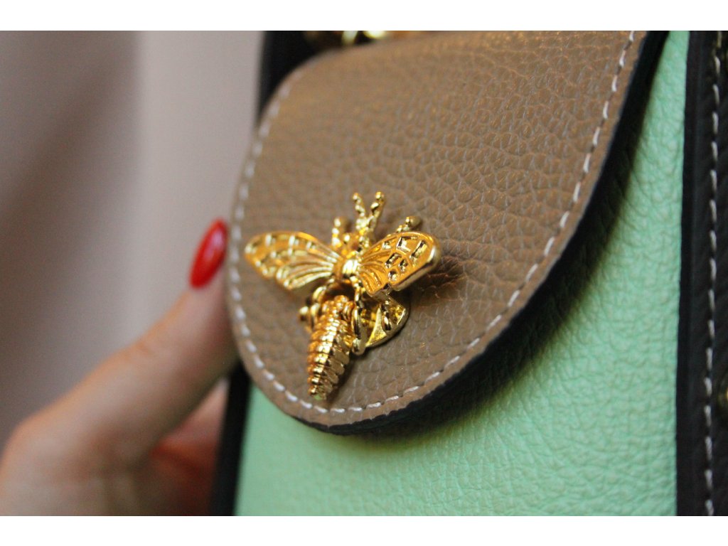 Kabelka Apis Verde je luxusní kožená kabelka z Itálie, která spojuje originalitu s nadčasovou elegancí. Vyrobena z vysoce kvalitní přírodní usně, kombinuje jemnou mentolovou zelenou, decentní béžovou a výraznou černou. Barevnost podtrhují oranžové akcenty a zlaté kování, včetně ikonického detailu – zlaté včely na klopě.