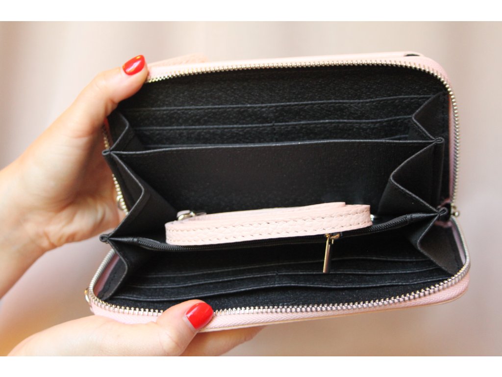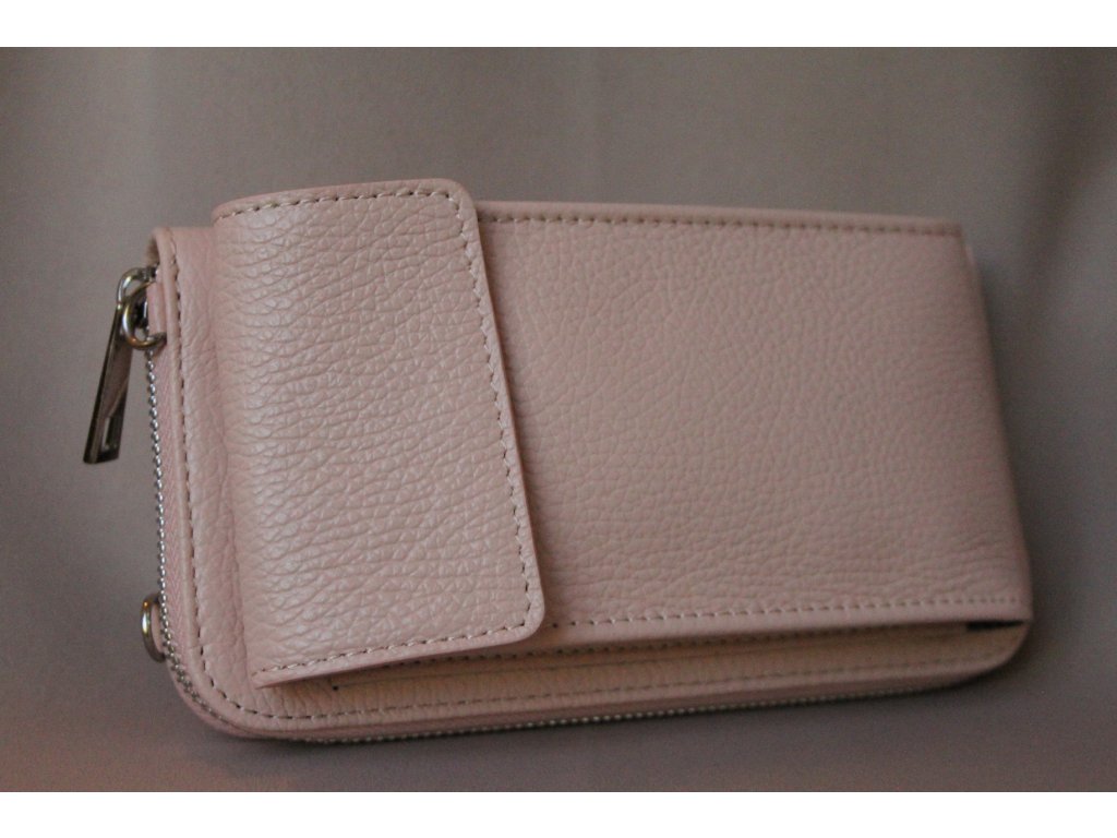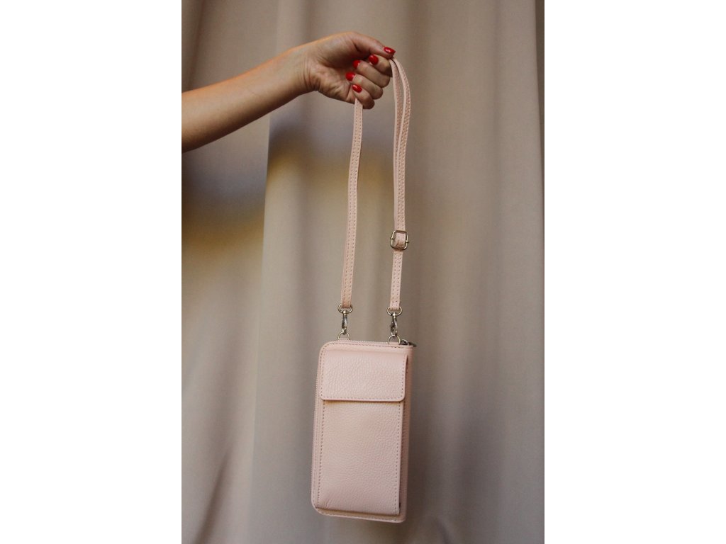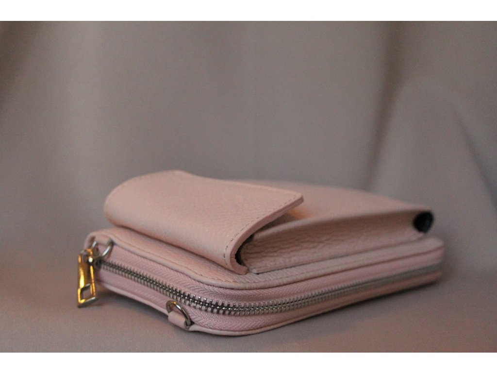 Kabelka Rosa Duo je luxusní dámská peněženka a crossbody pouzdro na mobil v jednom, vyrobená z pravé italské kůže v jemném odstínu pudrově růžové. Tento elegantní a praktický doplněk kombinuje funkci peněženky na karty, mince a bankovky s možností nošení jako mini crossbody kabelky.