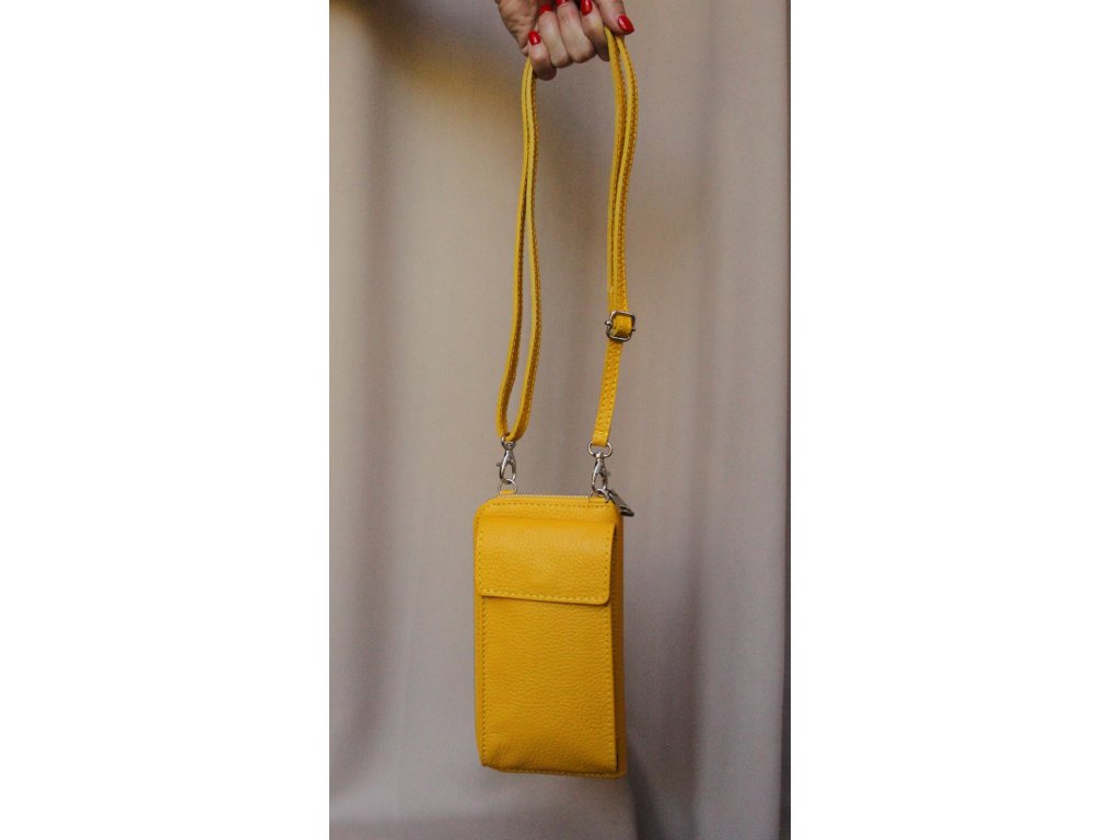 Kabelka Sole Dua je luxusní dámská peněženka a crossbody pouzdro na mobil v jednom, vyrobená z pravé italské kůže v zářivě žlutém odstínu. Tento originální doplněk kombinuje funkčnost peněženky na karty, mince a bankovky s praktičností mini kabelky, do které se pohodlně vejde i mobilní telefon a drobné nezbytnosti.