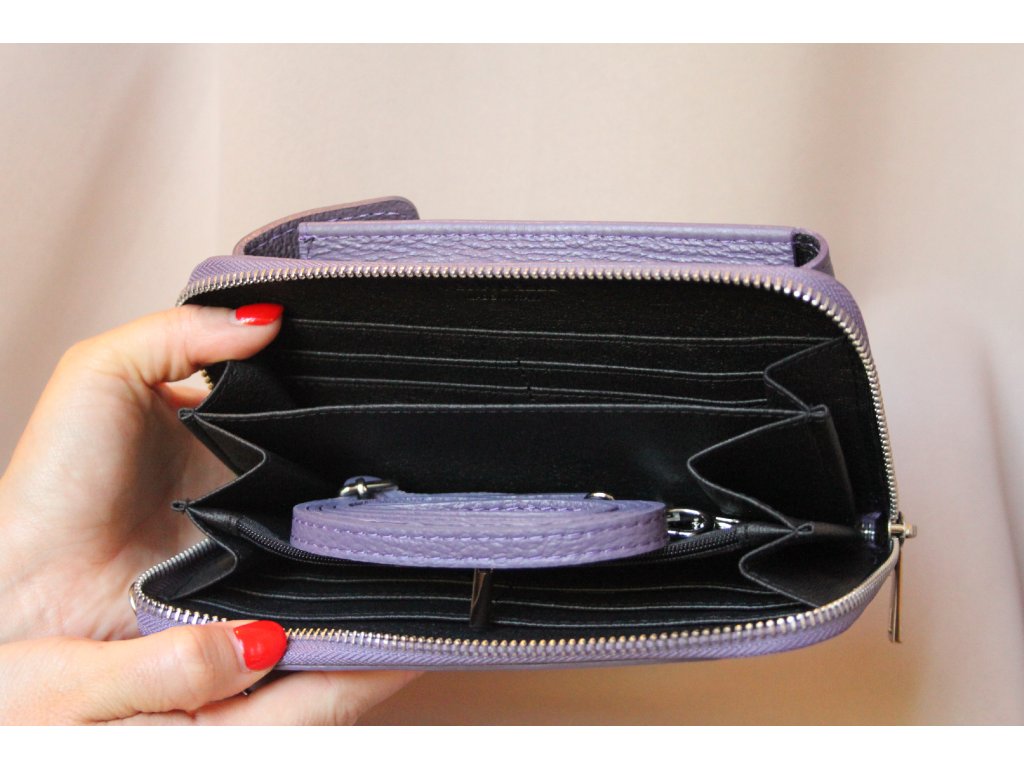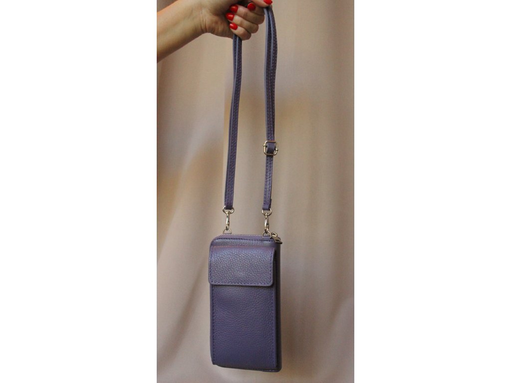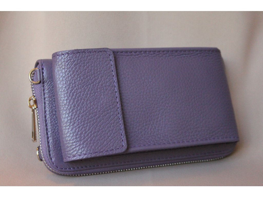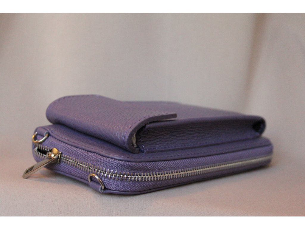 Kabelka Viola Dua je luxusní dámská peněženka a crossbody pouzdro na mobil v jednom, vyrobená z pravé italské kůže v elegantním odstínu levandulově fialové. Tento moderní doplněk spojuje praktičnost peněženky na karty, mince a bankovky s funkčností mini crossbody kabelky, do které pohodlně uložíte i mobilní telefon a další drobnosti.