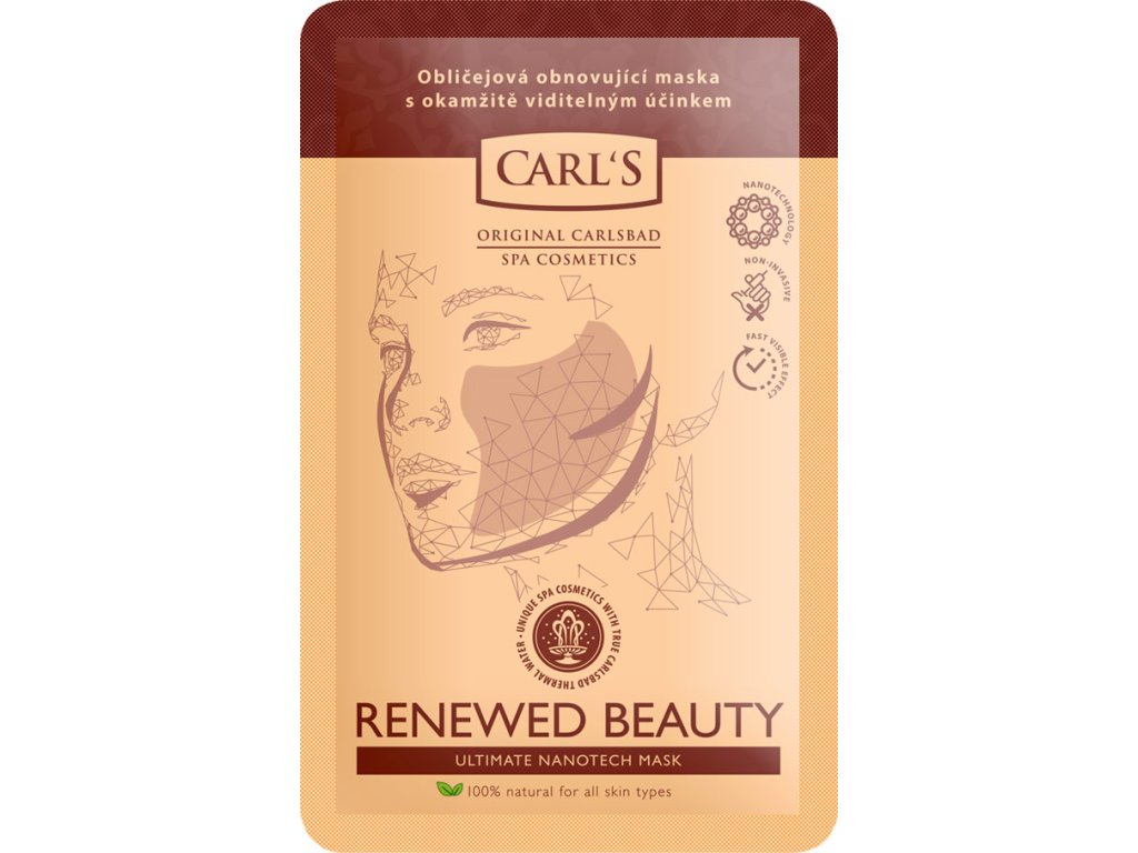 Charakteristika:Maska, která mění pravidla v péči o pleť. Tajemství jejího účinku skrývá unikátní českou nanotechnologii, díky níž se koktejl 100% přírodních aktivních látek dostane do potřebných vrstev pokožky bez použití jehel či jiných invazivních metod. Vše, co Vaše pleť potřebuje je tedy k dispozici v dostatečném množství, navíc doplněné o termominerální vodu z Karlových Varů. Síla přírody se tak může projevit ve své nejčistší podobě a to bez konzervantů a jakékoliv zbytečné chemie. Výsledkem je výrazný omlazující účinek masky, který je okamžitě viditelný a při pravidelném užívání i dlouhodobý. Pleť se opět rozzáří, je hydratovaná, pružná a vypnutá. Stopy času jsou potlačeny a kůže je chráněna před účinky oxidačního stresu.