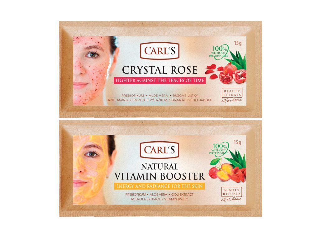 Speciální pečující kúra doporučená odborníky z CARL'S Beauty Rituals. Kombinace dvou vysoce účinných masek restartuje Vaši pleť. Balení obsahuje 4 masky - 2x masku CARL`S Crystal Rose a 2x masku CARL`S Natural Vitamin Booster včetně doplňků potřebných pro jejich aplikaci.